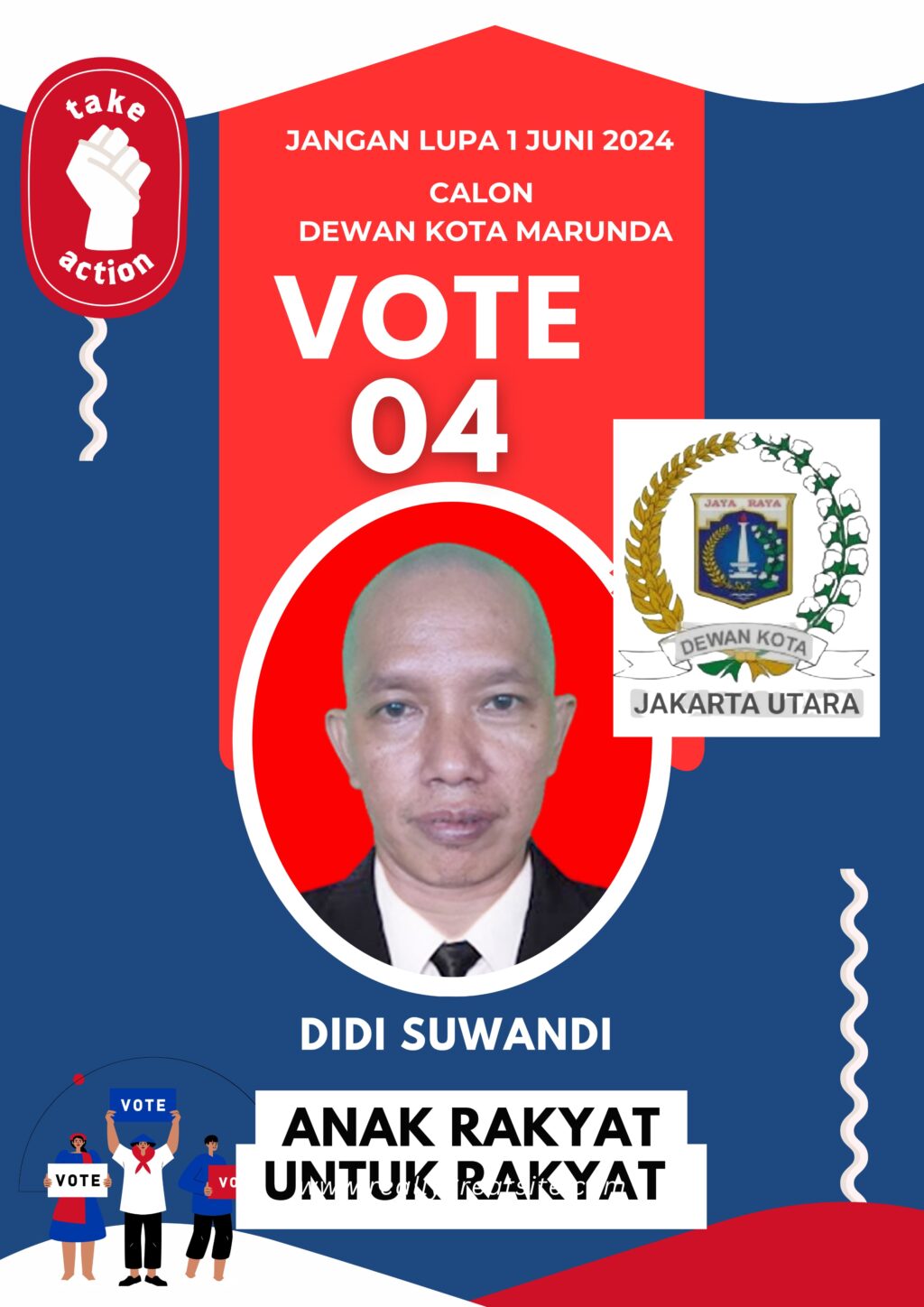 Jakarta – Dengan Slogan ” Anak Rakyat untuk Rakyat ” Didi Suwandi wakili RW 10 Kelurahan Marunda ikut kompetisi Pemilihan Dewan Kota Jakarta Utara dengan Nomor Vote 4 siap bertarung dalam visi misi dan kerja nyata sebagai calon dewan kota.