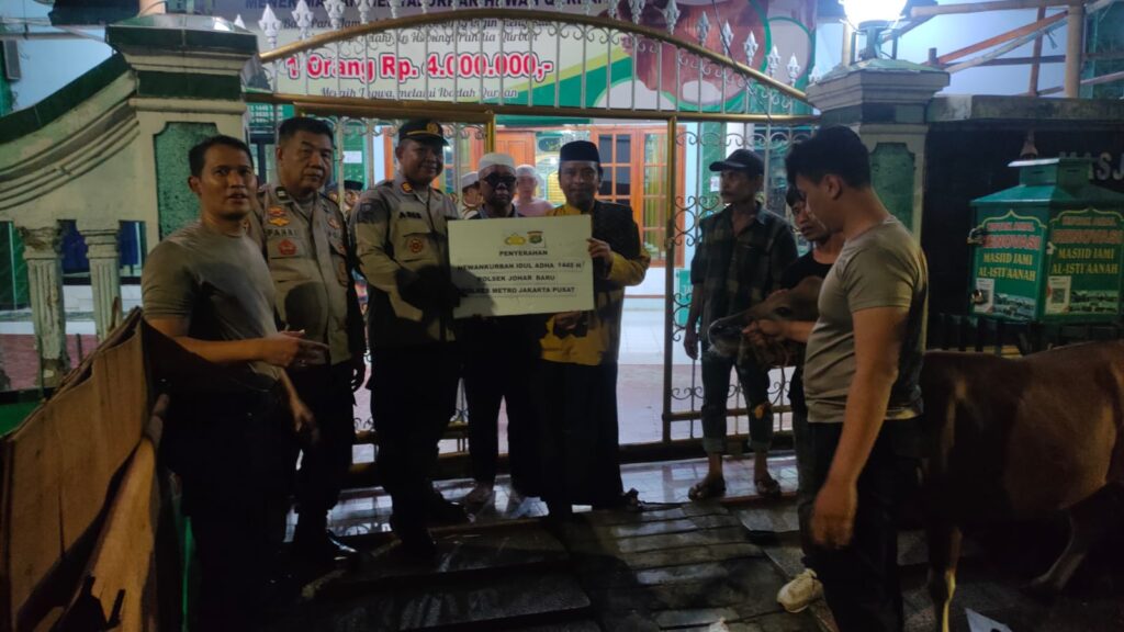 Jakarta Pusat _ Dalam rangka menyambut Idul Adha 1445 Hijriah, Kapolsek Johar Baru Kompol Ubaidillah, SH., MA., melalui Kanit Binmas AKP Aris Setiawan,SH., bersama Anggota Polsek Johar Baru menyerahkan hewan qurban 1 (Satu) ekor Sapi ke Masjid Al-Istianah di jalan Kramat Pulo Gundul III RW 09 Kelurahan Tanah Tinggi, Kecamatan Johar Baru Jakarta pusat. Minggu (16/6/2024).