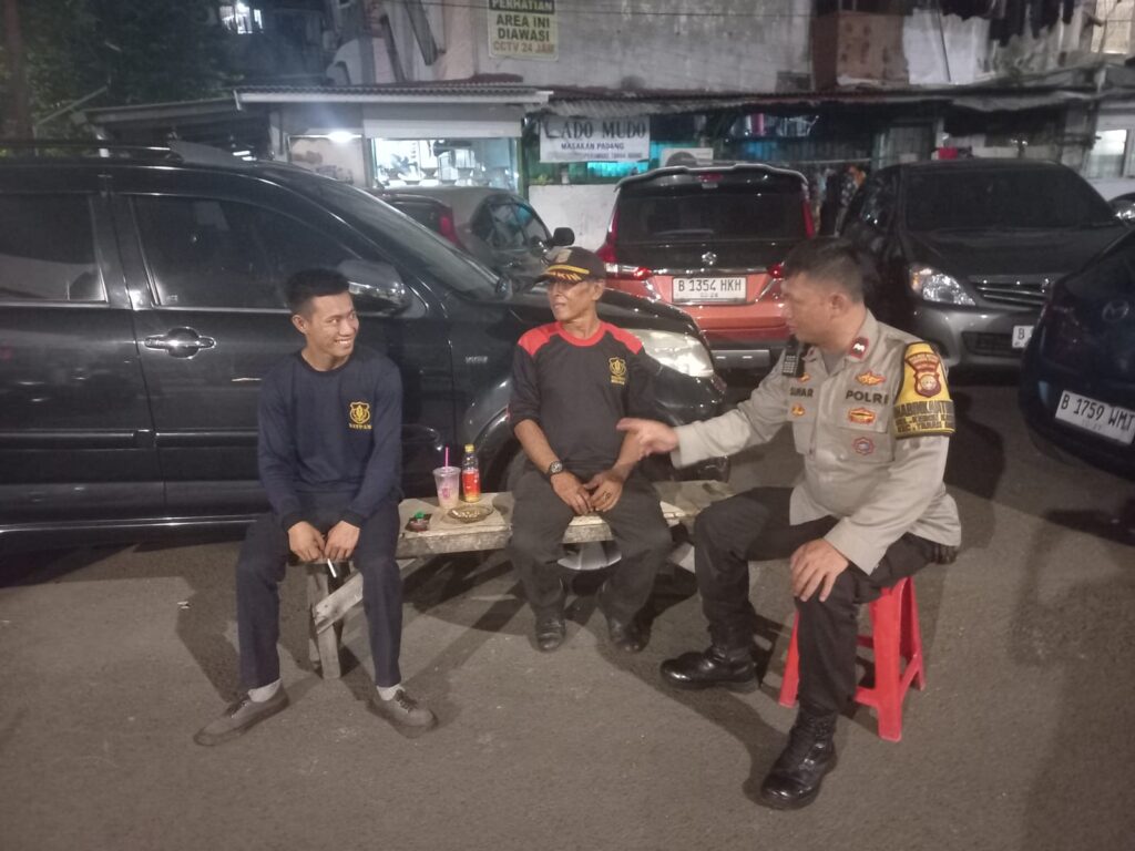Jakarta Pusat – Bhabinkamtibmas Kelurahan Kebon Kacang Aipda Suhartono Melaksanakan Patroli Dialogis dan Sambangi Petugas Siskamling Iwan dan Santo di Pos RW 10 Jalan KH Mas Mansyur No 25 A RW 10 Kelurahan Kebon Kacang Kecamatan Tanah Abang Jakarta Pusat. Selasa (18/6/2024).