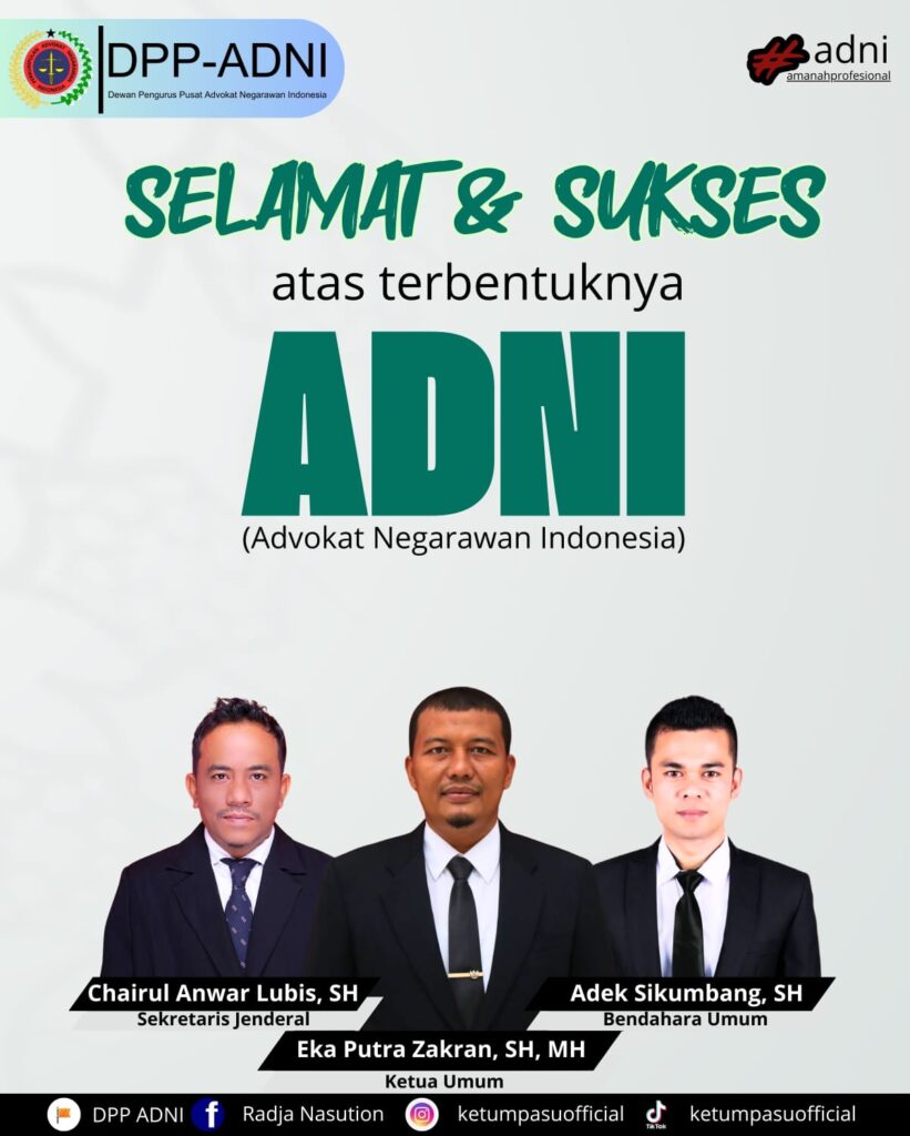 Berdasarkan surat pernyataan tanggal 4 Januari 2025 yang ditandatangani 6 orang dewan pendiri tersebut, Eka Putra Zakran, SH., MH ditetapkan sebagai Ketua Umum Dewan ex Officio Ketua Dewan Pendiri, Chairul Anwar Lubis, SH sebagai Sekretaris Jenderal, Adek Sikumbang, SH sebagai Bendahara Umum. Sementara itu, Ridesman, SH., SKM., M.Kes, MH.Kes ditetapkan sebagai Ketua Dewan Pembina dan Roos Nelly, SH., MH ditetapkan sebagai Ketua Dewan Pengawas. Disamping itu, anggota dewan pendiri juga memberikan mandat penuh kepada Eka Putra Zakran, SH., MH selaku Ketua Umum untuk menyusun komposisi DPP ADNI masa bakti 2025-2030, sesuai rumusan AD/ART bahwa 1 periode kepengurusan adalah 5 tahun.